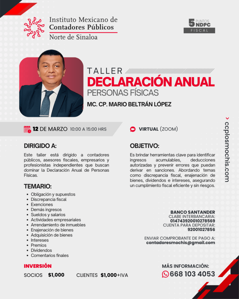 En este taller virtual, el Mtro. Mario Orlando Beltrán López abordará los temas clave de la Declaración Anual 2024, incluyendo obligaciones fiscales, ingresos acumulables, discrepancia fiscal, enajenación de bienes, dividendos, intereses y más.