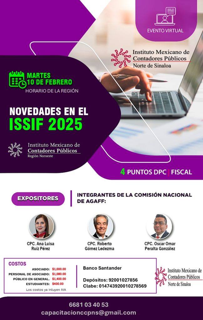 Mantente al día con los cambios y criterios más relevantes del ISSIF 2025 en este evento virtual organizado por el Instituto Mexicano de Contadores Públicos, Región Noroeste.
